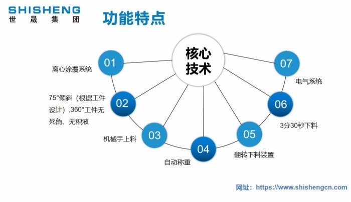 世晟集團(tuán)800系列全自動達(dá)克羅涂覆生產(chǎn)線的設(shè)計和制造,是基于使用各種有鉻、無鉻達(dá)克羅涂料(水劑和油劑)對金屬工件進(jìn)行表面涂覆工作,也可用于其它非鋅鋁涂料的零件表面涂覆、著色或封閉加工。全自動浸甩一體機(jī)由浸槽(SUS304)、甩干機(jī)構(gòu)(可傾斜)、槽體、槽蓋、涂液攪拌裝置、涂液回收裝置、涂液溫度調(diào)節(jié)系統(tǒng)、工件回轉(zhuǎn)輸送系統(tǒng)(升降采用氣缸)、涂液攪拌控制系統(tǒng)和料筐、小車翻轉(zhuǎn)上料裝置、伸縮式網(wǎng)帶輸送機(jī)、稱重系統(tǒng)。